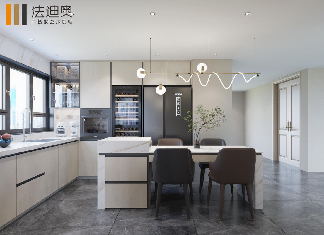 यह कस्टम किचन कैबिनेट एक विभेदित फिनिश रणनीति के आसपास बनाया गया है: लकड़ी के दाने को स्टेनलेस स्टील कैबिनेट संरचना के साथ जोड़ा गया है। यह संयोजन खरीदारों को स्टेनलेस स्टील कैबिनेटरी से अपेक्षित सफाई और परियोजना स्थायित्व को खोए बिना एक गर्म लक्जरी अभिव्यक्ति देता है।