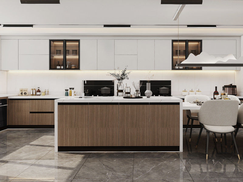 यह कस्टम रसोई कैबिनेट एक अलग खत्म रणनीति के आसपास बनाया गया हैः वुड ग्रेन / व्हाइट प्रीमियम स्टेनलेस स्टील कैबिनेट संरचना के साथ जोड़ा गया।यह संयोजन खरीदारों को स्टेनलेस स्टील कैबिनेटरी से अपेक्षित सफाई और परियोजना स्थायित्व को खोए बिना एक गर्म लक्जरी अभिव्यक्ति देता है.