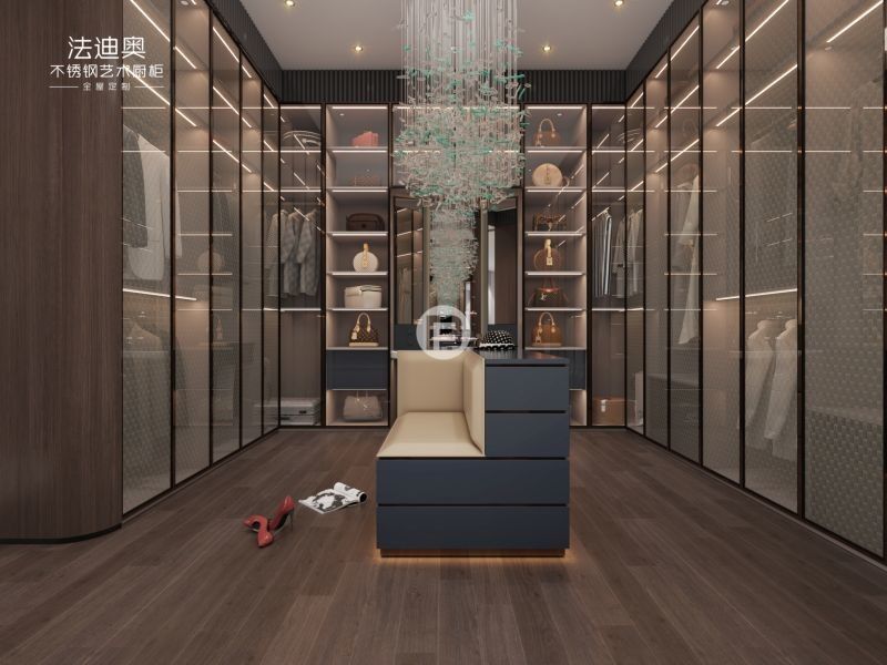 यह कस्टम वार्डरोब एक अलग फिनिश रणनीति के आसपास बनाया गया हैः वुड ग्रेन / ब्लू स्टेनलेस स्टील कैबिनेट संरचना के साथ जोड़ा गया।यह संयोजन खरीदारों को स्टेनलेस स्टील कैबिनेटरी से अपेक्षित सफाई और परियोजना स्थायित्व को खोए बिना एक गर्म लक्जरी अभिव्यक्ति देता है.