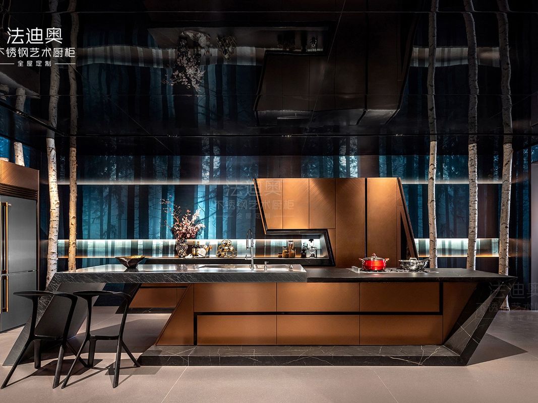 यह कस्टम किचन कैबिनेट एक विभेदित फिनिश रणनीति के आसपास बनाया गया है: रोज़ गोल्ड को स्टेनलेस स्टील कैबिनेट संरचना के साथ जोड़ा गया है। यह संयोजन खरीदारों को स्टेनलेस स्टील कैबिनेटरी से अपेक्षित सफाई और परियोजना स्थायित्व को खोए बिना एक गर्म लक्जरी अभिव्यक्ति देता है।
