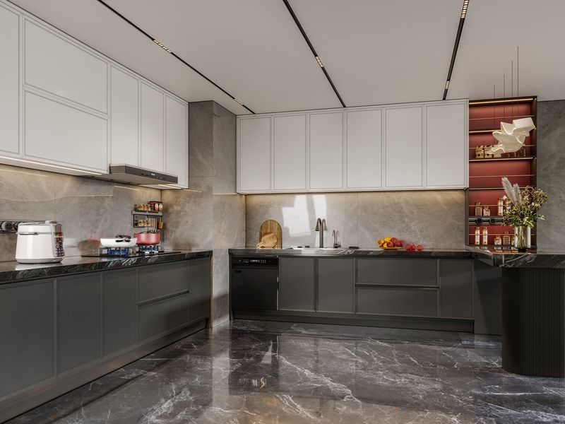 इस किचन कैबिनेट को एक सामान्य SKU के बजाय एक डिज़ाइन-आधारित सिस्टम के रूप में प्रस्तुत किया गया है। यह प्रीमियम आवासीय परियोजनाओं के लिए एक अधिक सुसंगत दृश्य पहचान बनाने के लिए सफेद/काला रंग प्रीमियम स्टेनलेस स्टील कैबिनेट संरचना के साथ उपयोग करता है।