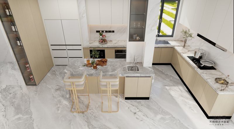 यह कस्टम रसोई कैबिनेट एक अलग फिनिश रणनीति के आसपास बनाया गया हैः वुड ग्रेन / व्हाइट स्टेनलेस स्टील कैबिनेट संरचना के साथ जोड़ा गया।यह संयोजन खरीदारों को स्टेनलेस स्टील कैबिनेटरी से अपेक्षित सफाई और परियोजना स्थायित्व को खोए बिना एक गर्म लक्जरी अभिव्यक्ति देता है.