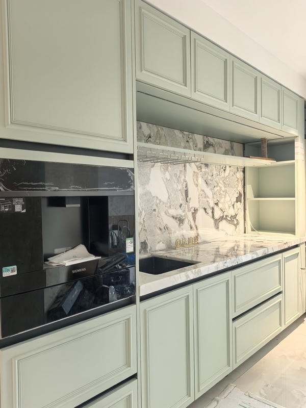 इस किचन कैबिनेट को एक सामान्य SKU के बजाय एक डिज़ाइन-आधारित सिस्टम के रूप में प्रस्तुत किया गया है। यह प्रीमियम आवासीय परियोजनाओं के लिए एक अधिक सुसंगत दृश्य पहचान बनाने के लिए बेज / हरा रंग स्टेनलेस स्टील कैबिनेट संरचना के साथ उपयोग करता है।